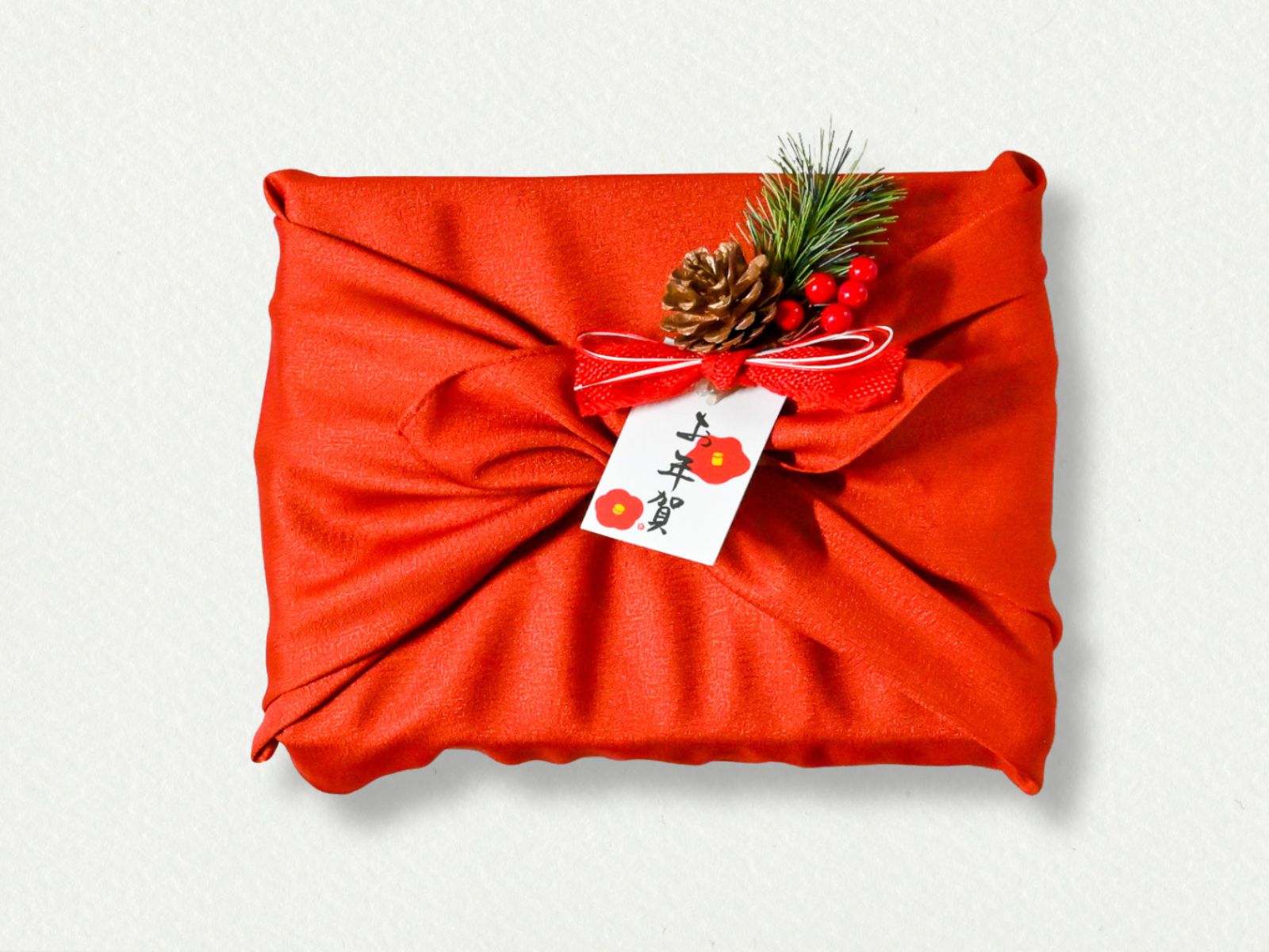 深い朱色の布に、松や南天の小さな飾りを添え、お正月らしい晴れやかさをまとわせた特別な仕立てです。